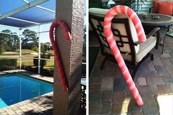 Bend a red pool noodle into the shape of a candy cane. Then use clear fishing line to tie and hold the hook shape in place.