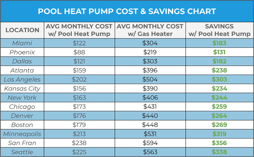 Use this table to estimate your monthly pool heat pump cost and savings compared to gas heaters.