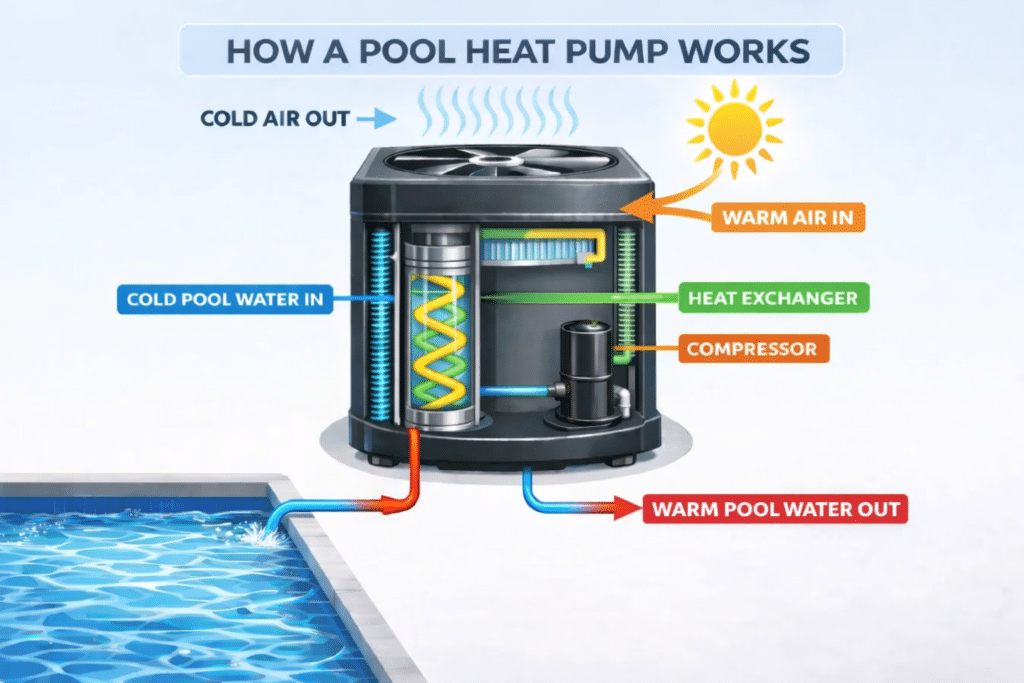 Pool heat pumps work like your AC in reverse — they extract heat from the air and transfer it to your pool water. Because they move heat rather than create it, they’re remarkably efficient and produce zero direct emissions.