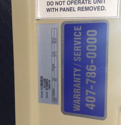 Facing the front of the unit, both the serial and model numbers are printed along a silver sticker located near the top left corner: